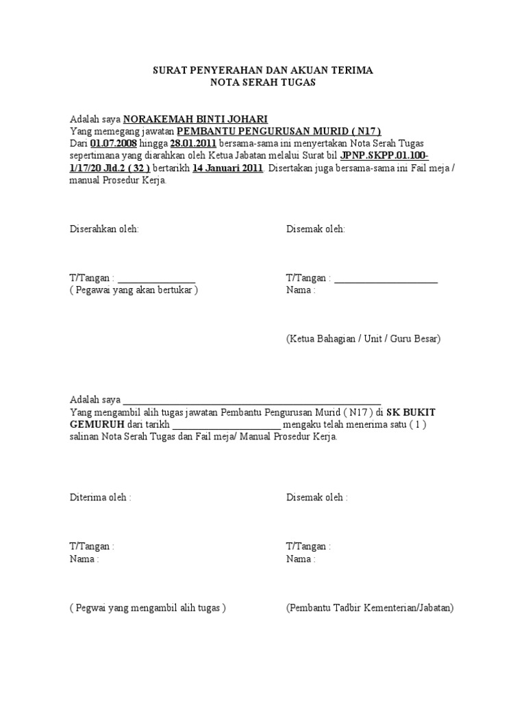Surat serahan tugas / surat serahan tugas nota serah tugas surat penyerahan dan akuan surat serahan tugas nota serah tugas.borang kutipan dan serahan guru ke pejabat darjah. Lampiran senarai serahan tugas bi l 1. Susunan panitia serah serahan & akad nikah ika puspa dewi, skm binti dirham dullah dengan insan halim bin k. Ali hamsa kepada ketua setiausaha negara. Ketua setiausaha negara tan sri dr.
